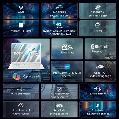 Acer Nitro Lite 16,Gaming Laptop, Intel Core i5-13420H Processor, NVIDIA GeForce RTX 4050-6 GB GDDR6, 16 GB DDR5/ 512 GB, 16.0″/40.64 cm, 165 Hz, Win 11 Home, White, 1.95 kg, NL16-71G, Backlit Keyboard