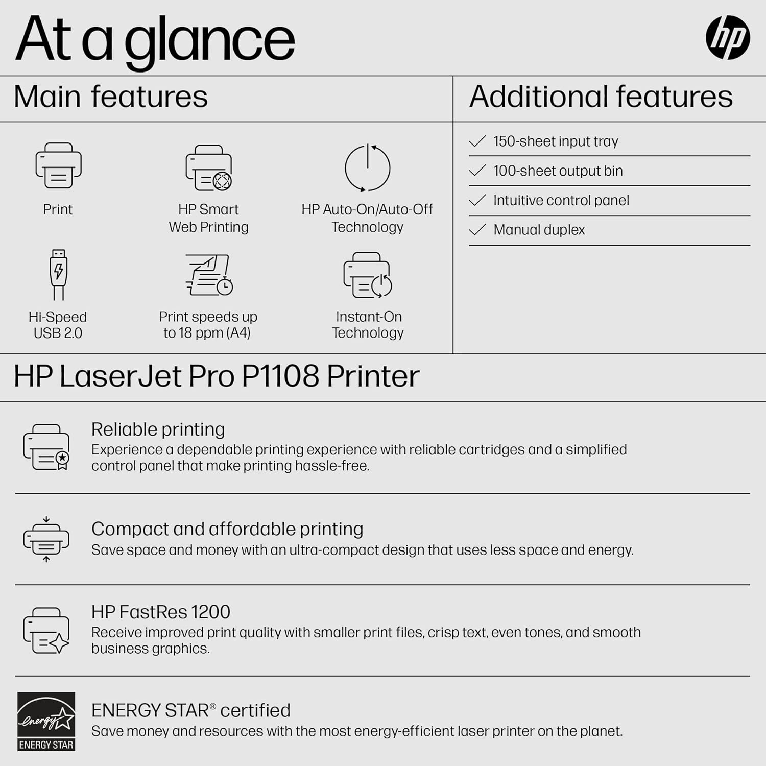 HP Laser 1008a Printer, Single Function, Print, Hi-Speed USB 2.0, Up to 21 ppm, 150-sheet Input Tray, 100-sheet Output Tray, 10,000-page Duty Cycle, 1-Year Warranty, Black and White